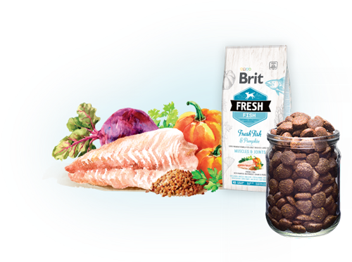 Formula nutritionala super premium de la Brit Fresh este imbunatatita cu peste proaspat, dovleac, sfecla rosie si patrunjel.
